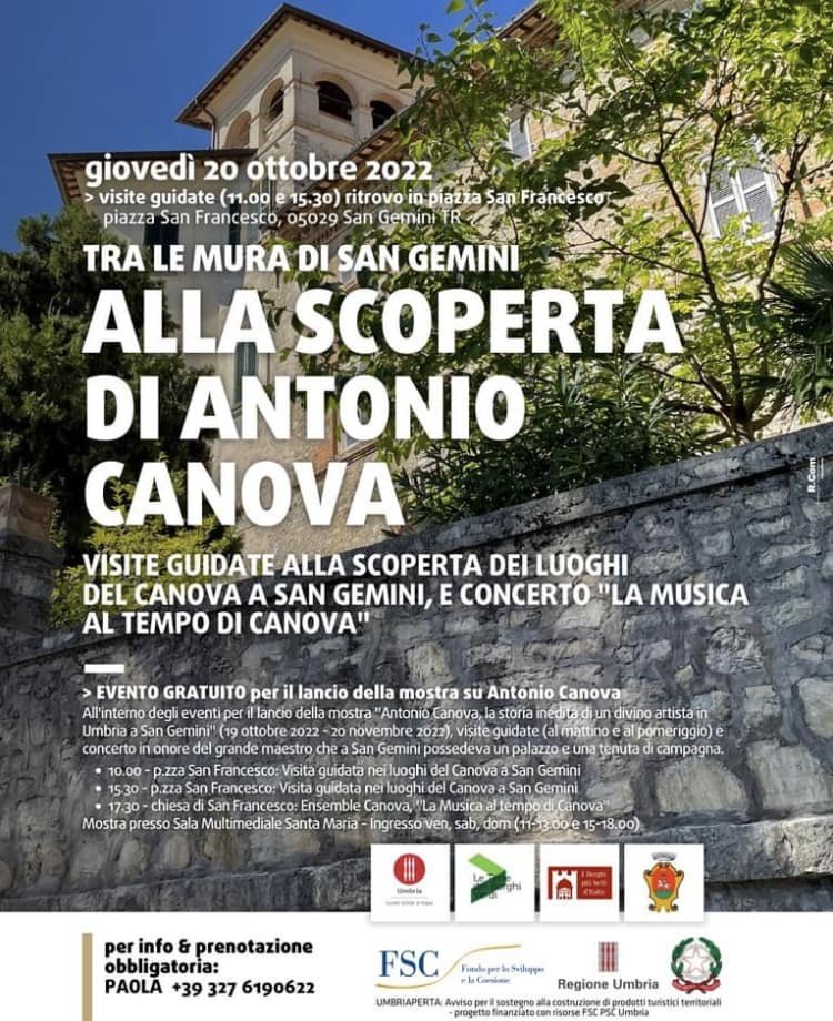 Nel bicentenario della morte di Canova, San Gemini rinsalda il legame che ebbe con il divino scultore di Possagno - che possedeva il bel palazzo che ancora oggi si affaccia su piazza San Francesco e un podere in località Vallantica - con l’inaugurazione del 19 ottobre alle ore 15:00 di una mostra dedicata , alla Sala Multimediale Santa Maria Maddalena, giovedì 20 ottobre, con due visite guidate (una al mattino e una al pomeriggio) e un concerto di musica classica serale.