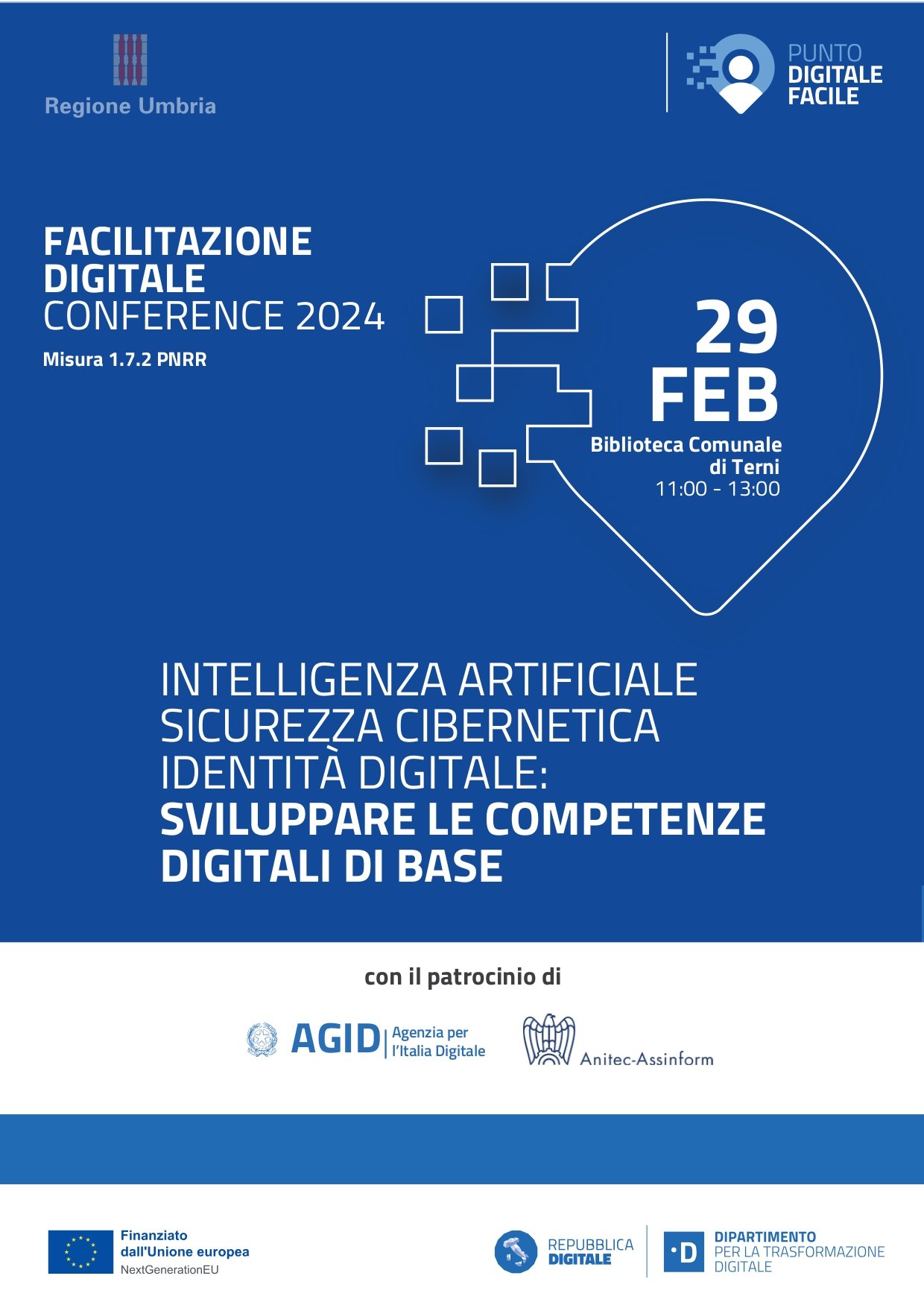 L’evento è patrocinato dall’Agenzia per l’Italia Digitale (AGID) e da Anitec-Assinform e si svolgerà giovedì 29 Febbraio presso la Biblioteca Comunale di Terni dalle ore 11:00 alle ore 13:00.